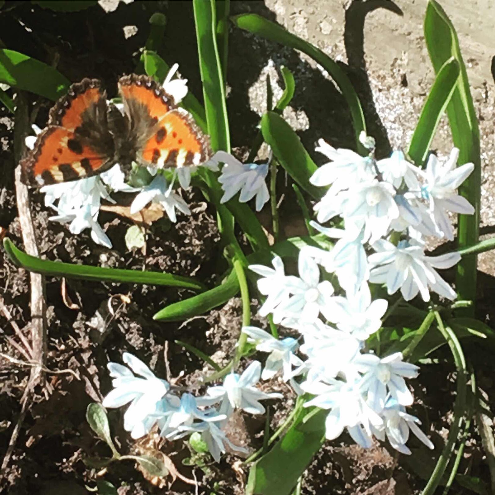 Vi har fortfarande snö kvar på gården men i rabatten framför huset, sydsidan, där är det vår.