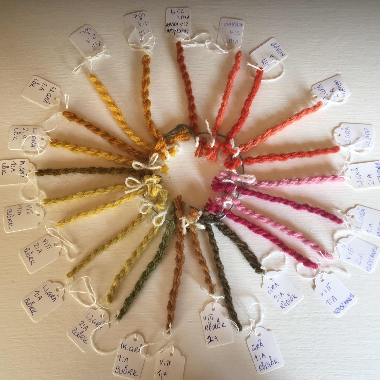 Så här har jag nu samlat mina prover, kallas dockor, från växtfärgningen i början av juli. Tvinnat en liten provtuss av varje färg och skrivit på etiketten, att det är alunbetat, färgat med tex gul lök, grundfrägen tex vit eller ljusgrå, om det är 1.a eller 2:bad och årtalet.